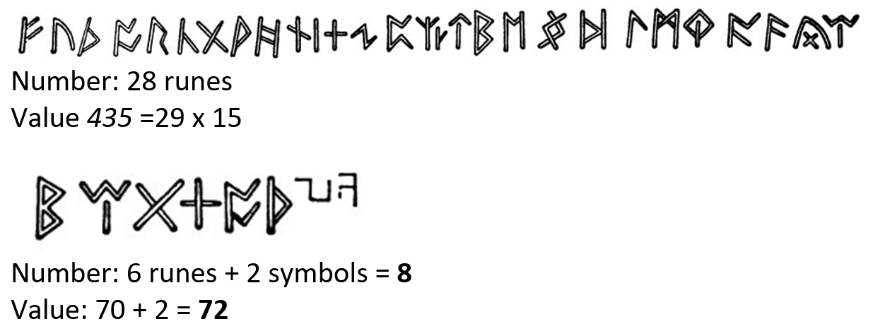 The 28 runes produce a value that makes sense: 435. It can be interpreted as 29 x 15. The rune is the 15th letter in Fuþorc as well as in Fuþark and it stands for the Valkyrie. This way her assistance as helper in battle is called upon.